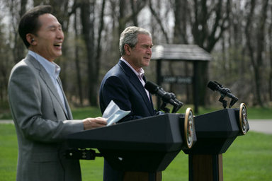 President Lee is the first Korean President to visit Camp David. And I don't know if the American citizens understand your nickname -- you're known as the "Bulldozer." (Laughter.) He said to make sure that it was a bulldozer with a computer. (Laughter.) And the reason why is this is a man who takes on big challenges and he doesn't let obstacles get in the way. I like his spirit, I like his candor, and I like his optimistic vision. But most of all I really appreciate his values.
